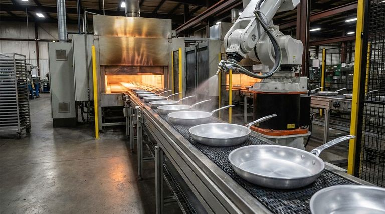Esta es la etapa más crítica. Después de aplicar las capas, los utensilios de cocina se introducen en hornos de alta temperatura en un proceso llamado sinterización.
